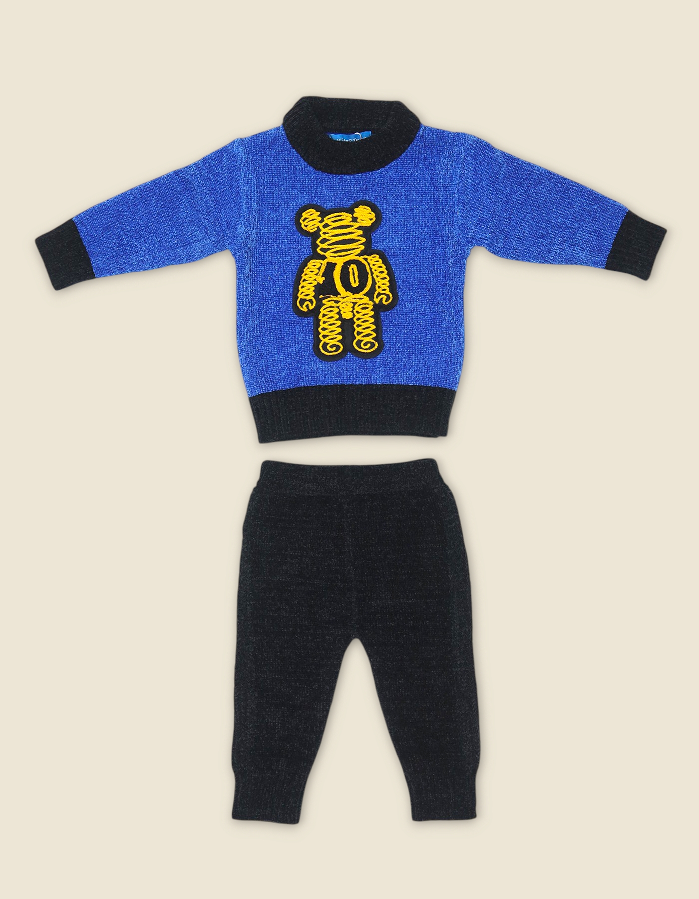 Stylish woolen outfit for boys with rope-texture teddy graphic sweater and matching pants. Designed for warmth, comfort and bold winter fashion.