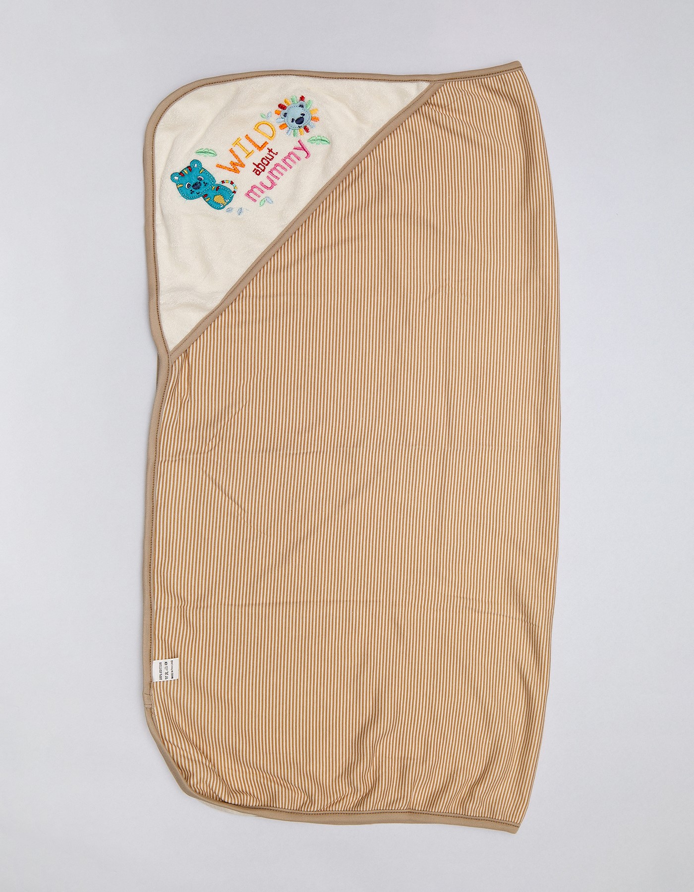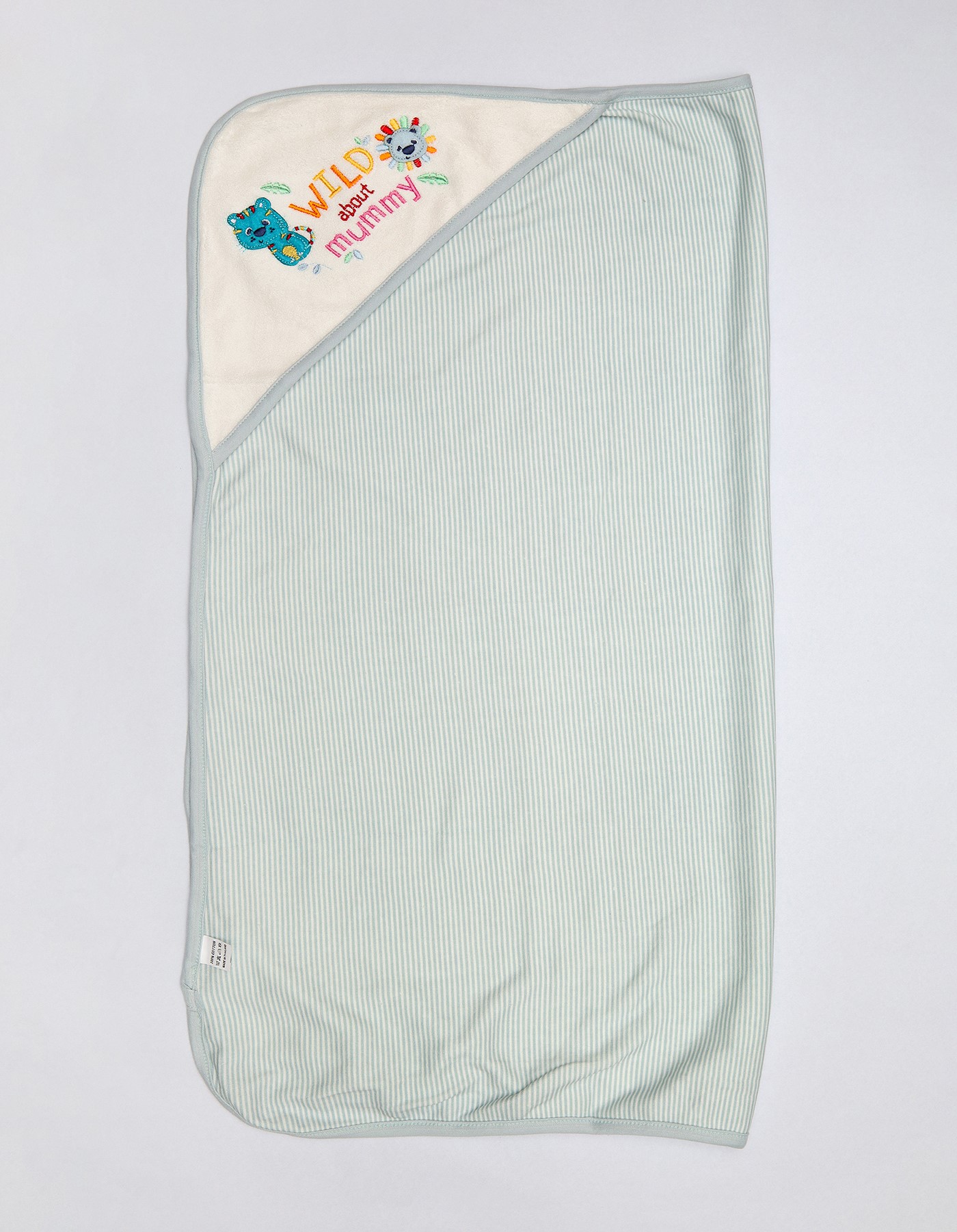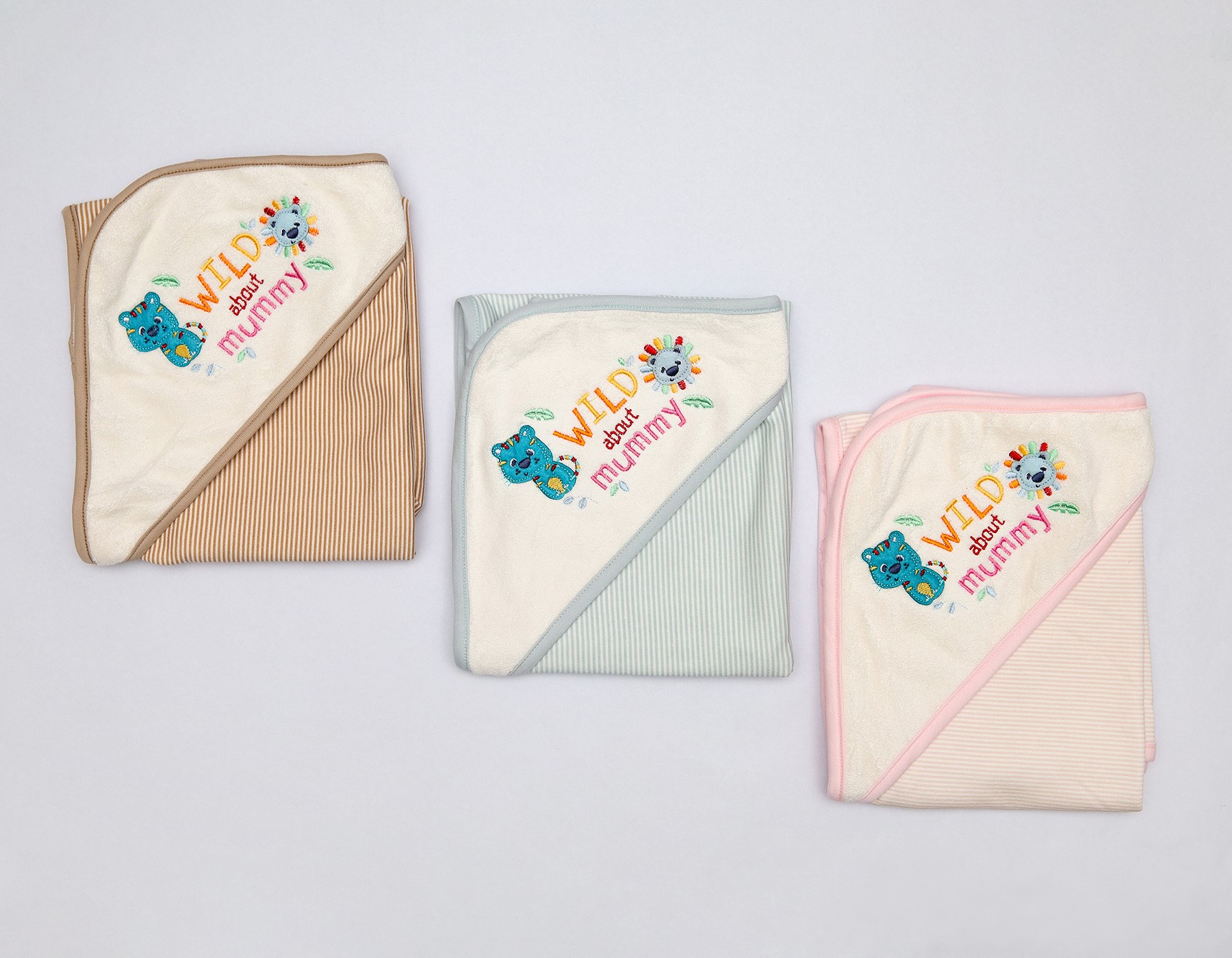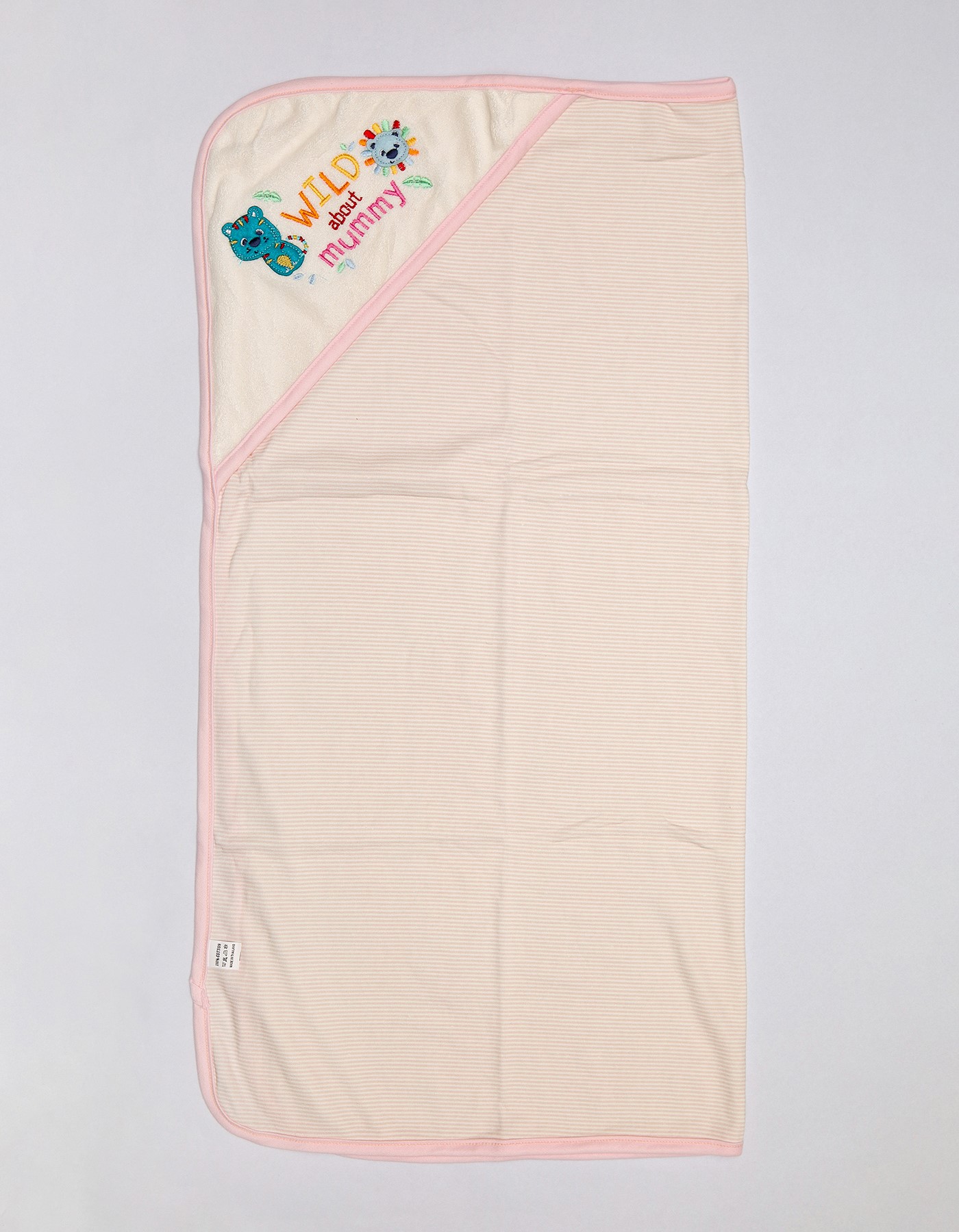 Ultra soft cotton hooded blanket with colorful animal embroidery and gentle striped fabric. Perfect for swaddling, bath time and everyday cuddles. Available in beige, green and pink.