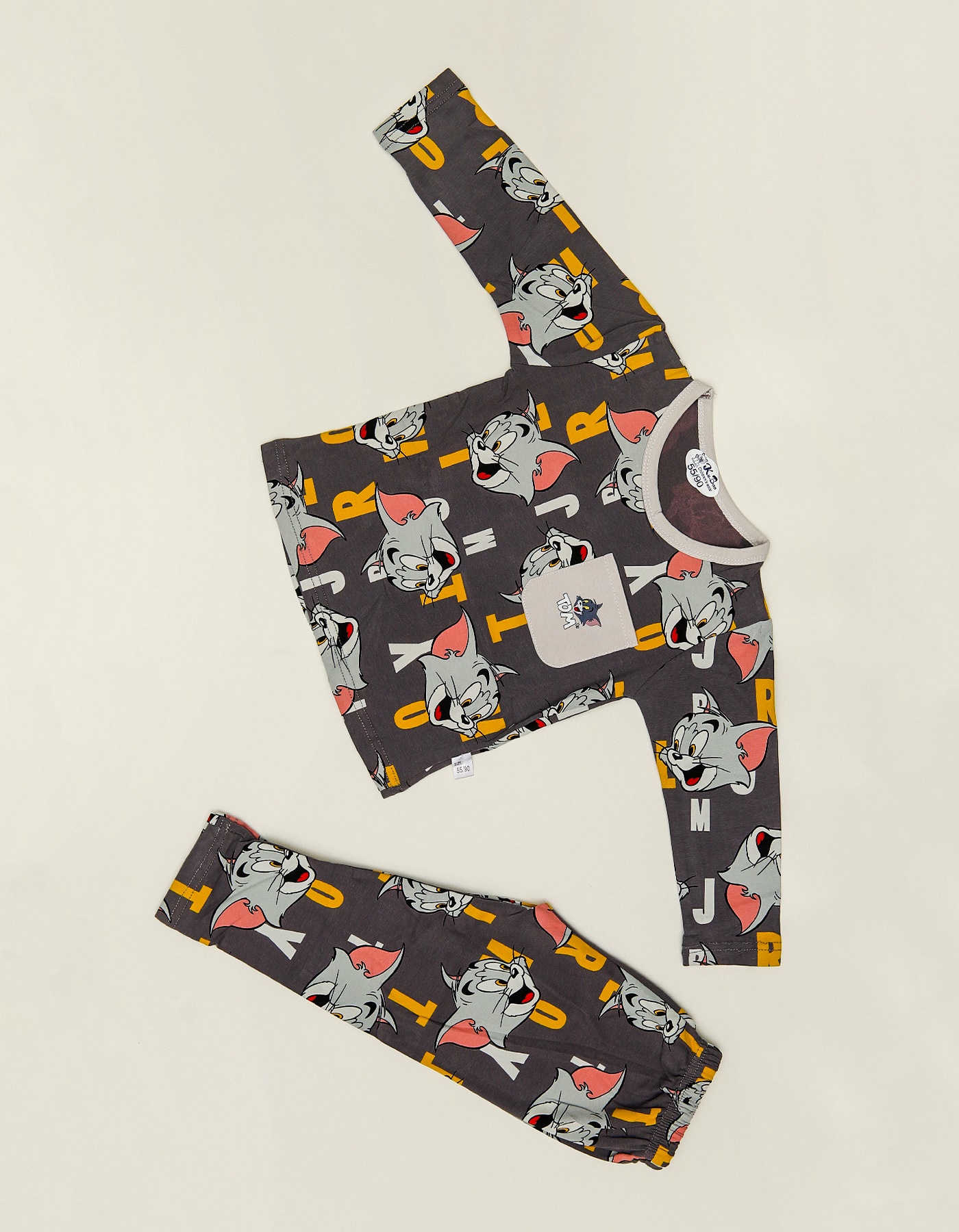 Turn bedtime into fun time with this Dark Grey Cartoon Print Boys Suit. Featuring playful cartoon character graphics with alphabet prints, this set includes a comfy long sleeve top and matching bottoms. The chest pocket adds a trendy detail, making it both stylish and practical. Made from soft, breathable fabric, it keeps kids cozy through sleep, lounging, or indoor play.