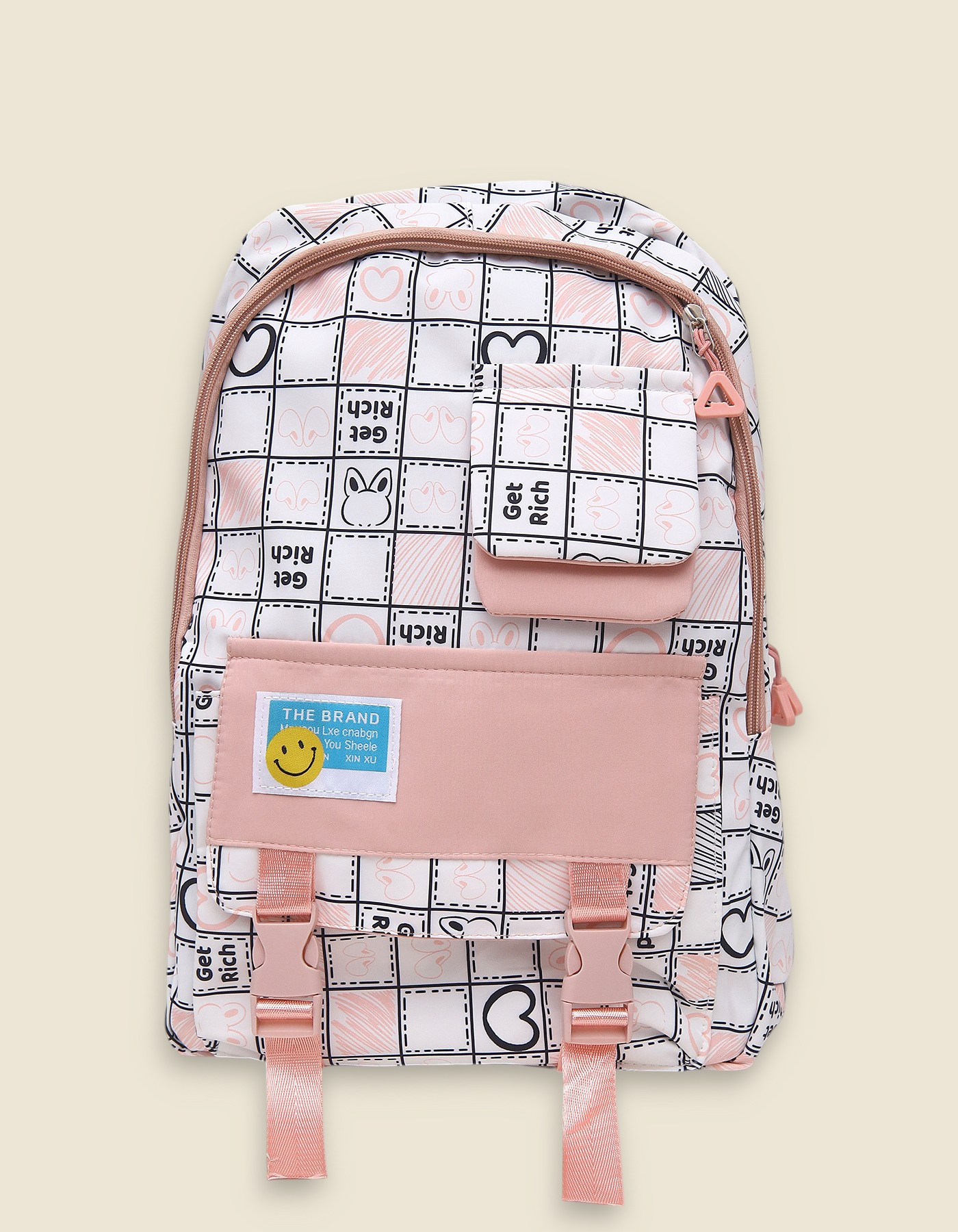 The Trendy Kids Printed School Bag is a fashionable and functional backpack designed for everyday school use. With a fun grid-style print featuring hearts, bunnies, and Get Rich text, it adds a playful yet modern touch to your childs school look. The bag includes a spacious main compartment, a secure front flap pocket with dual buckle straps, and a mini pouch pocket for small essentials. Made with durable material and finished in a soft baby pink accent, this bag is both stylish and practical for carrying books, stationery, and lunch boxes.