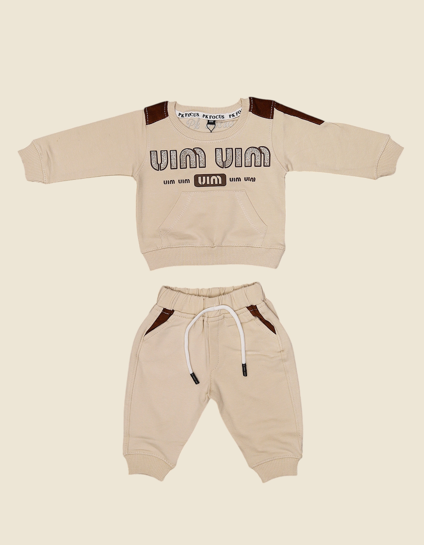 The VIM VIM Baby Outfit Set is a trendy and sporty 2-piece set designed for comfort and casual style. With its bold VIM VIM slogan sweatshirt and matching jogger pants, this outfit is perfect for playdates, outings, and everyday wear. The soft fabric ensures all-day coziness while the modern design makes your little one stand out. Available in Mustard Yellow and Skin Beige.