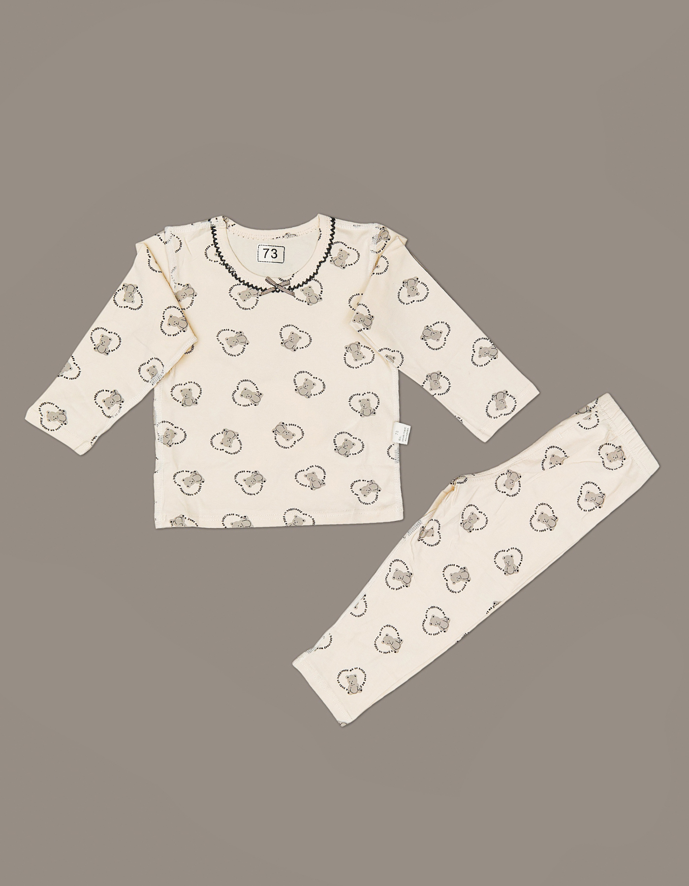Sweet and comfy, this girls suit features an adorable teddy bear face print all over a soft cream base. With its cute bow neckline detail and matching joggers, its perfect for everyday wear.