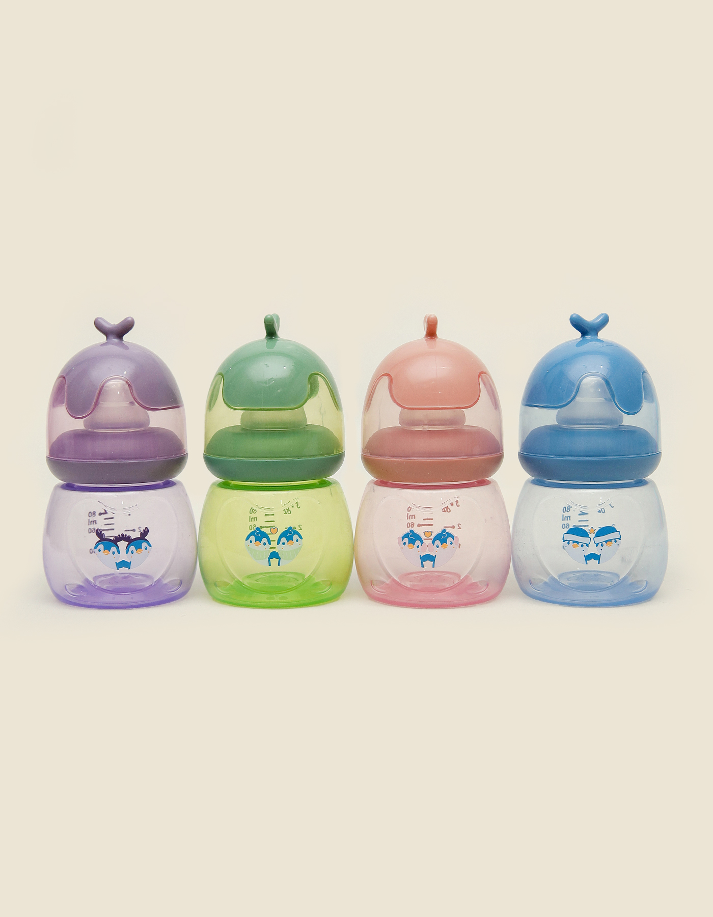 The Minitree Whale Cap Baby Feeding Bottles are a perfect blend of safety, practicality, and playful design, making feeding time fun and stress free. Each bottle features a cute whale shaped cap with a tail fin top and colorful lids in blue, pink, green, and purple, paired with cheerful cartoon prints.