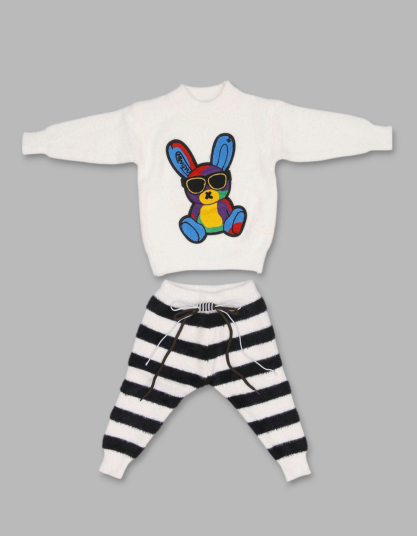 Bring playful charm and warmth to your boys winter wardrobe with this cozy woolen knit suit. The set features a white sweater with a colorful bunny-in-sunglasses design and black-and-white striped pants with a drawstring waist. Fun, stylish, and snug, it’s perfect for keeping little ones comfortable during colder days.