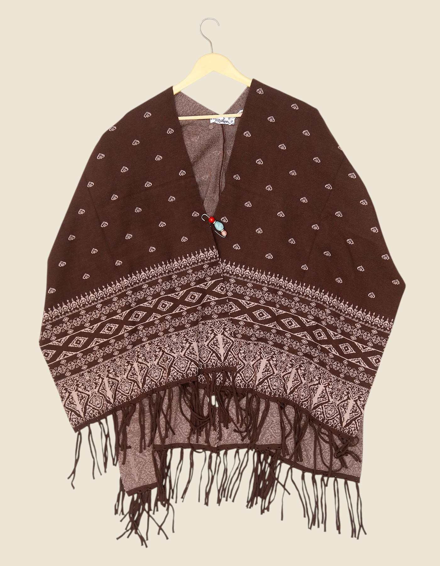 Wrap yourself in timeless elegance with this beautifully designed woolen poncho shawl. Featuring intricate ethnic-inspired patterns, a soft woven texture, and delicate tassel fringes, this versatile piece is perfect for keeping warm while adding a stylish touch to your outfit. Its open-front design with a decorative clasp makes it easy to wear for both casual and festive occasions.