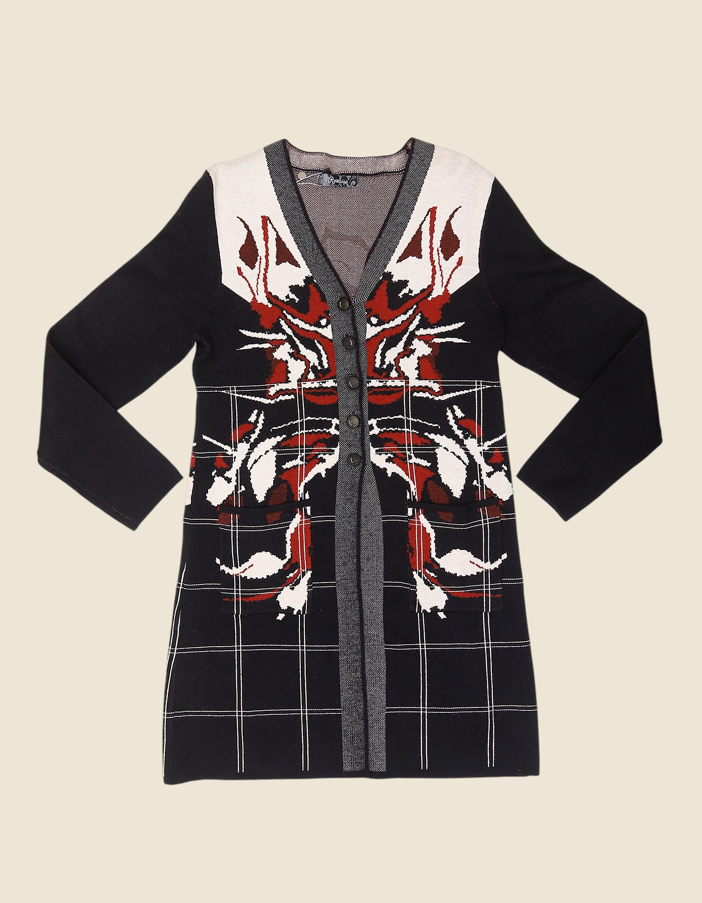 Add a modern twist to your winter wardrobe with this stylish long knitted cardigan. Featuring a bold abstract floral design in red, white, and grey on a black base, this cardigan blends warmth with high fashion. The button-down front, deep V-neck, and front pockets make it both practical and chic, while the long sleeves provide cozy coverage. Perfect for layering over casual or semi-formal outfits, this cardigan is a versatile must-have for the season.