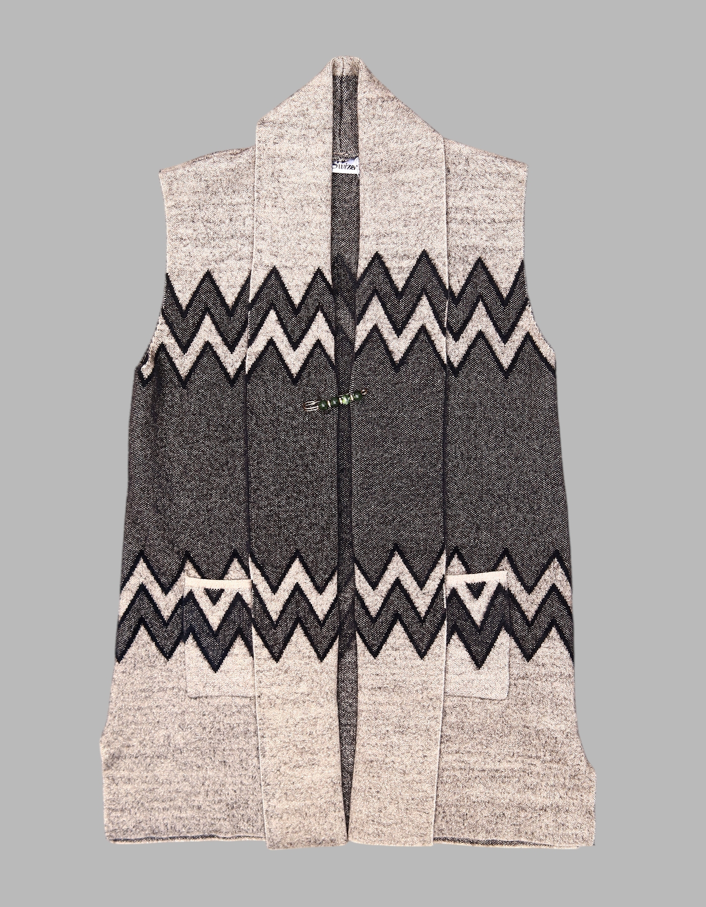 Add a touch of warmth and style to your outfit with this sleeveless woolen cardigan. Featuring a bold black zigzag pattern across a dual-tone beige and grey base, this piece combines modern design with cozy comfort. Its open-front style with a decorative clasp makes it easy to wear and layer over casual or semi-formal clothing, making it a versatile wardrobe essential.